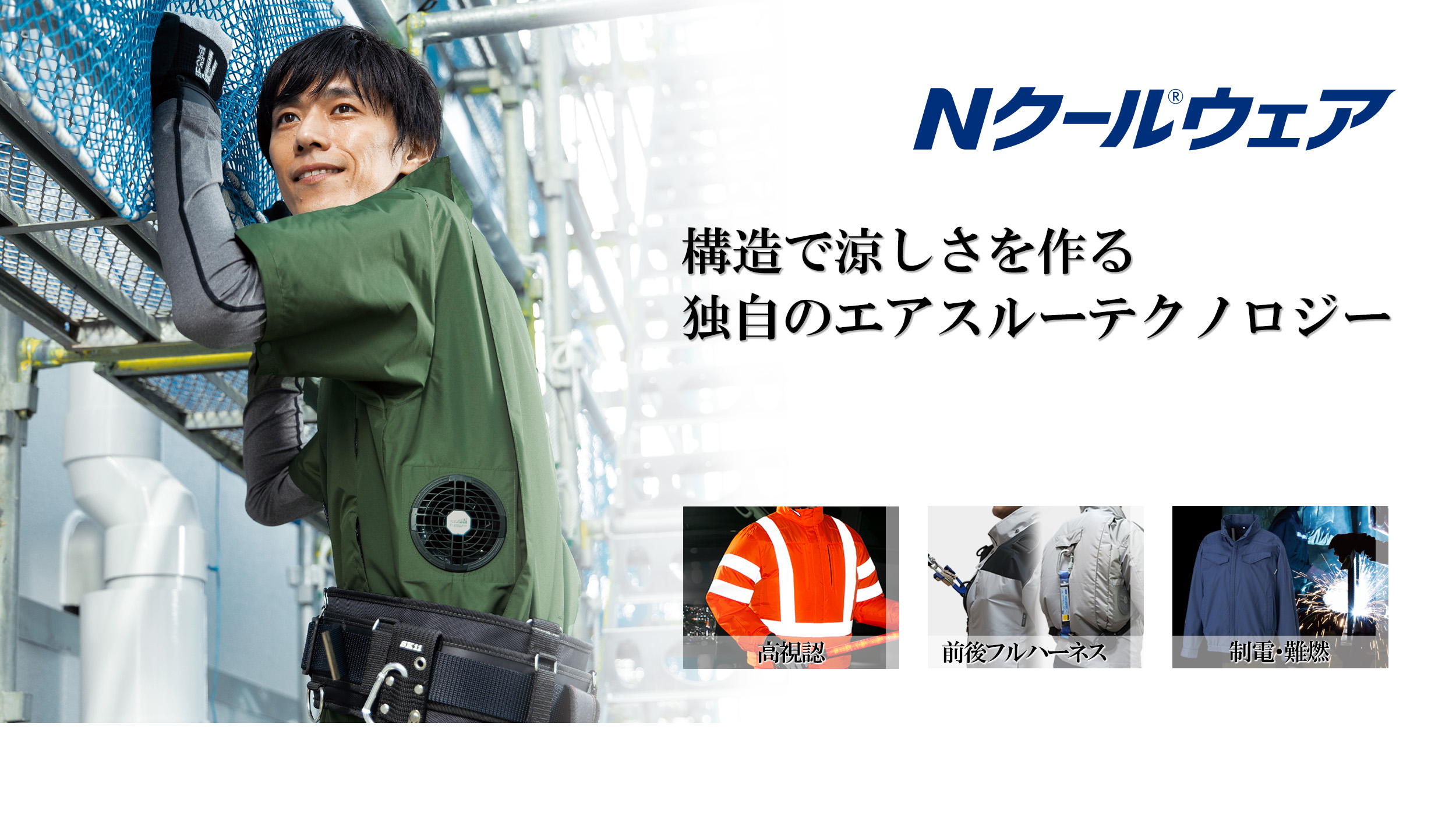 高所作業、工事現場、農業、レジャーなど、あらゆるシーンに対応するNクール®ウェアを取り揃えています。