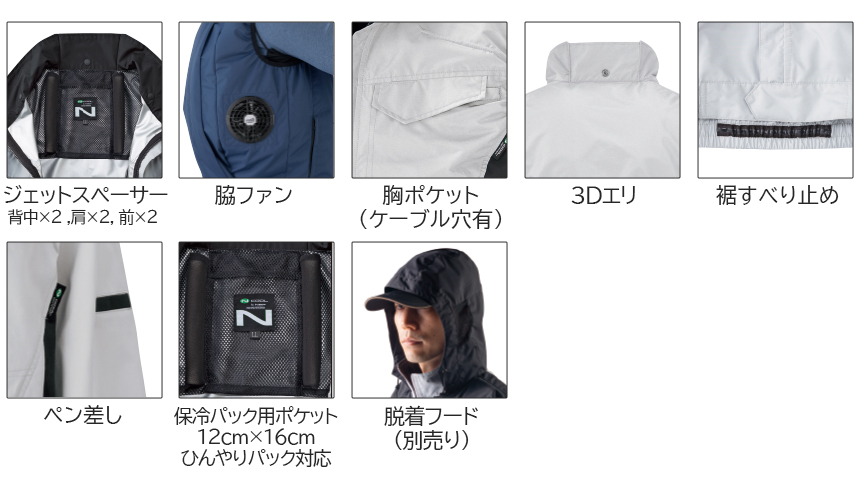 Nクール®ウェアは背中と肩の特殊スペーサーにより、立体的に風路を形成し背中から首筋へ風を通す設計となっています。