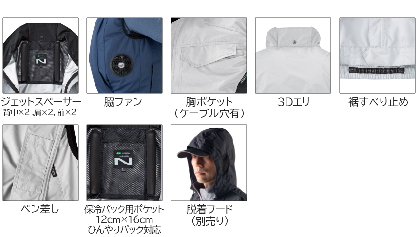 Nクール®ウェアは背中と肩の特殊スペーサーにより、立体的に風路を形成し背中から首筋へ風を通す設計となっています。