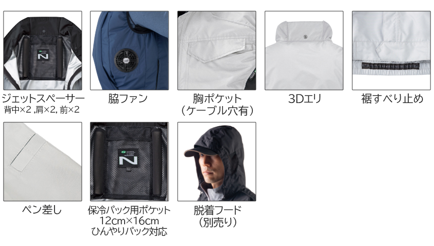 Nクール®ウェアは背中と肩の特殊スペーサーにより、立体的に風路を形成し背中から首筋へ風を通す設計となっています。