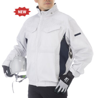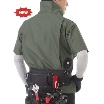 ターンナップ裾で風漏れを抑え、長時間の作業でも快適フィット。フルハーネス装着時も腕の可動域を確保。脇ファンタイプで冷却効率と作業性を両立。服素材ポ…
